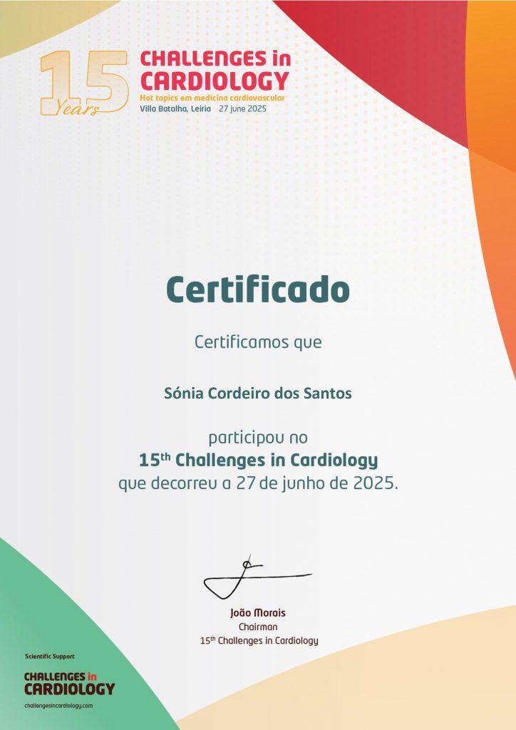 Sónia Santos, a doctoral fellow at ciTechCare conducting research in the field of heart failure, participated in the 15th edition of the “Challenges in Cardiology” congress, held on June 27, 2025, at Hotel Villa Batalha in Leiria. Her participation was made possible through the awarding of one of the ten grants allocated to “Students in the Health Sciences.”